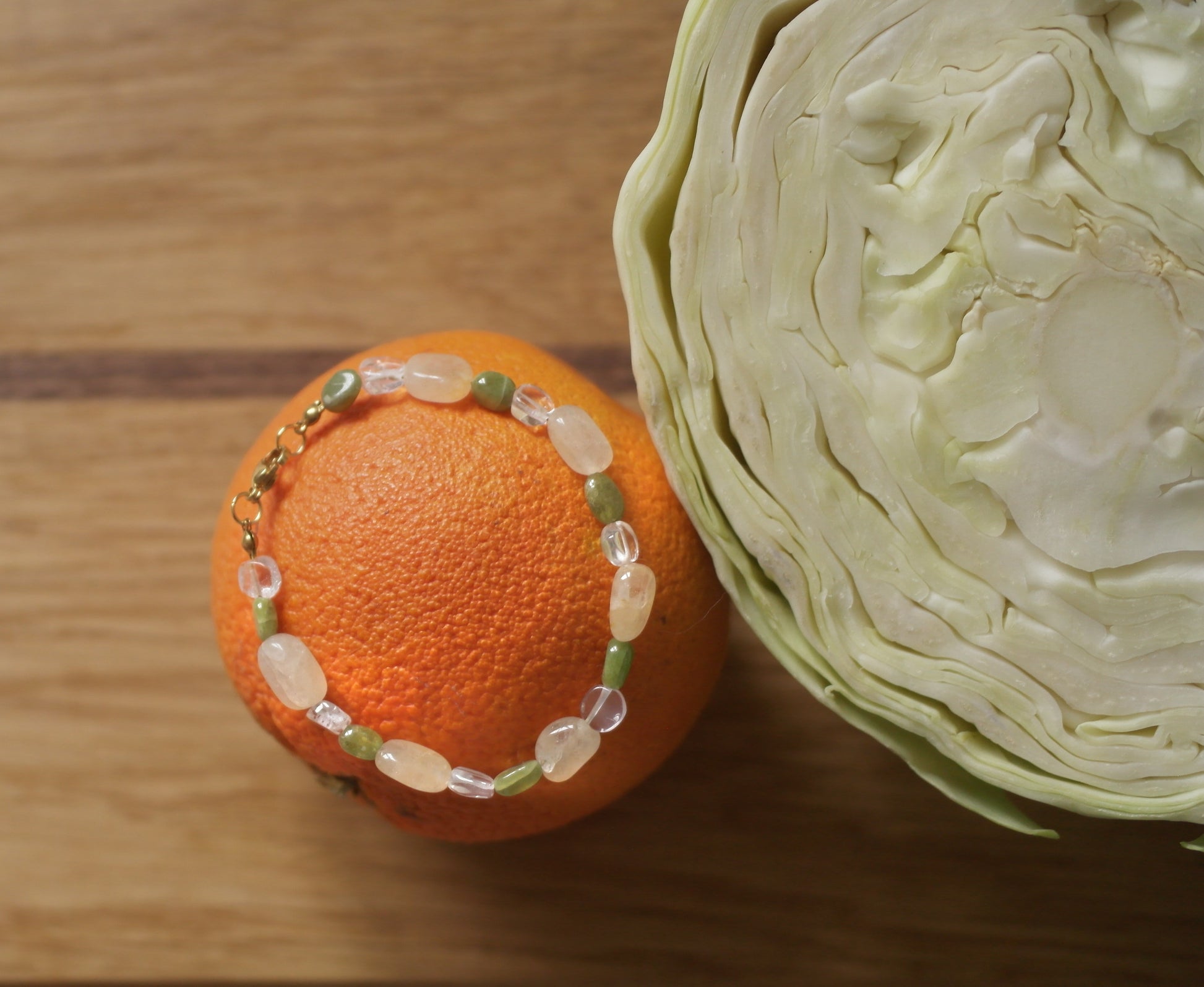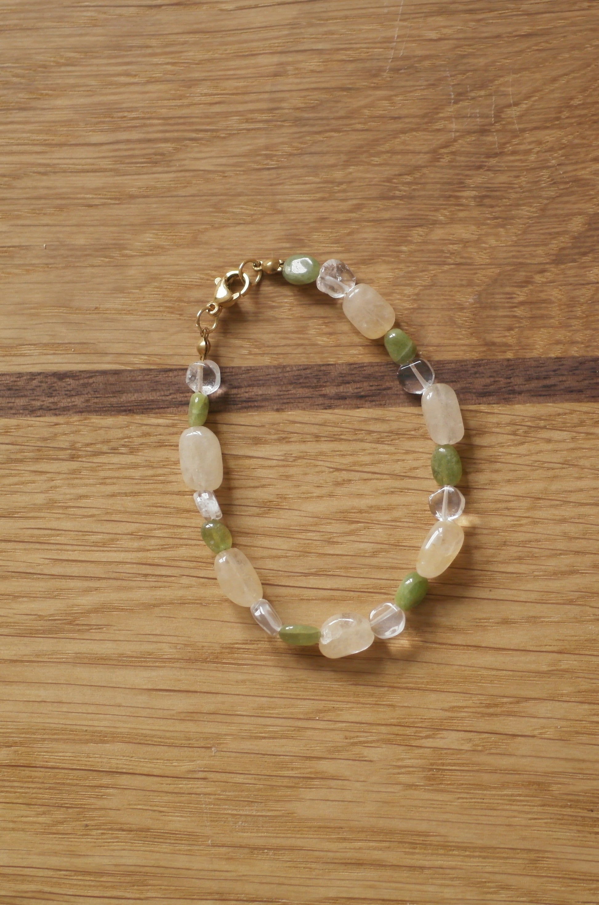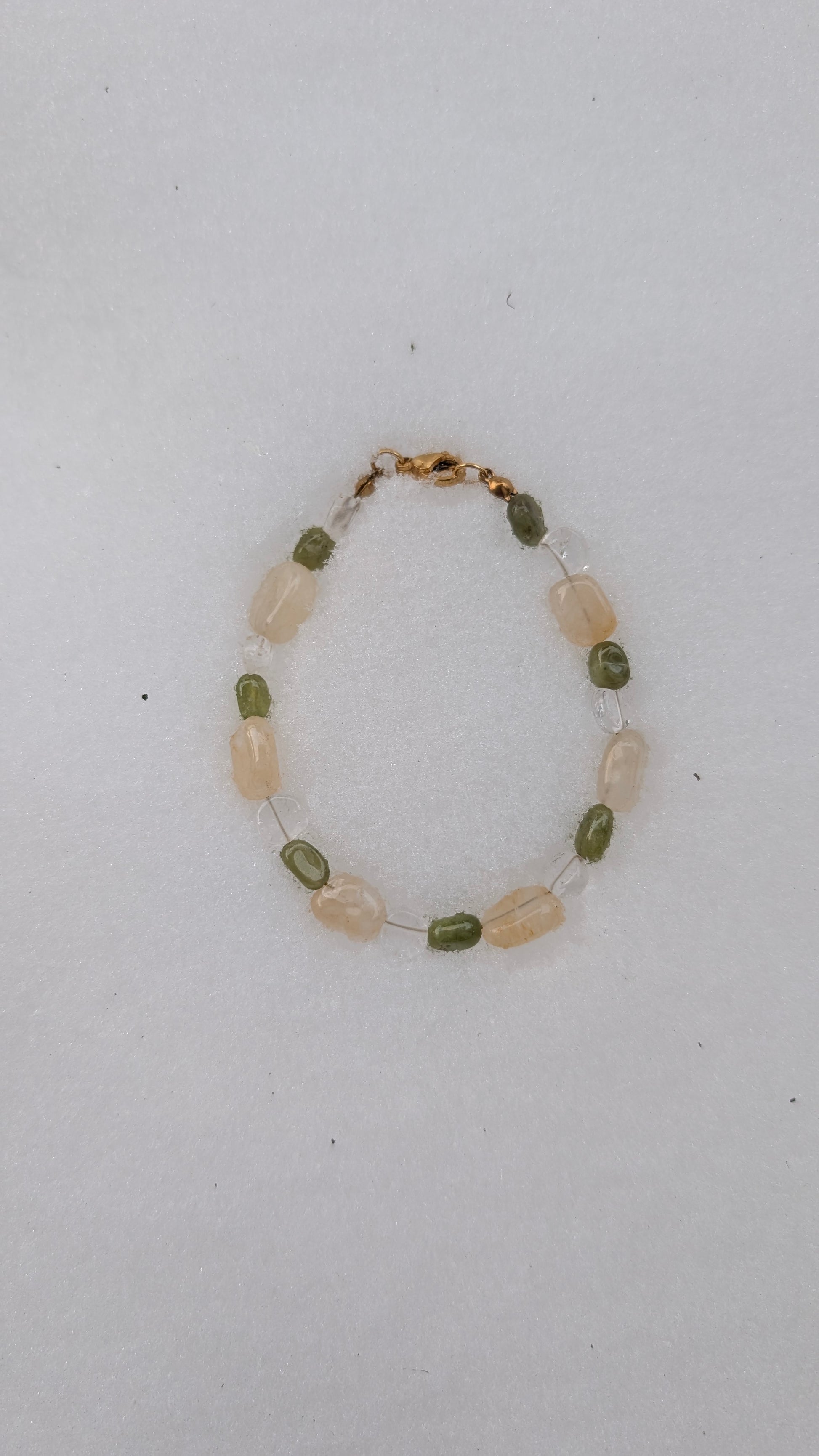 ein schönes Armband aus Bergkristall, Serpentin und Calcit. Da es ein Einzelstück ist, ist es nur in gold erhältlich. Auf Wunsch kann eine kleine Verstellkette angebracht werden.