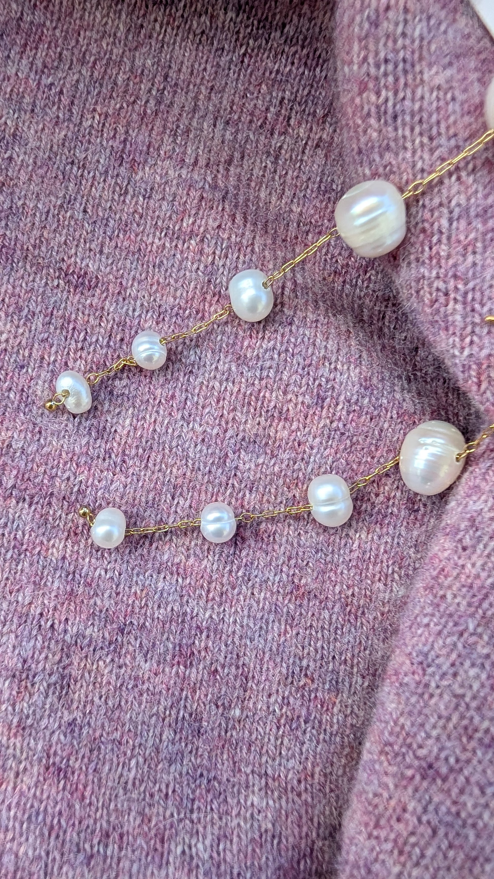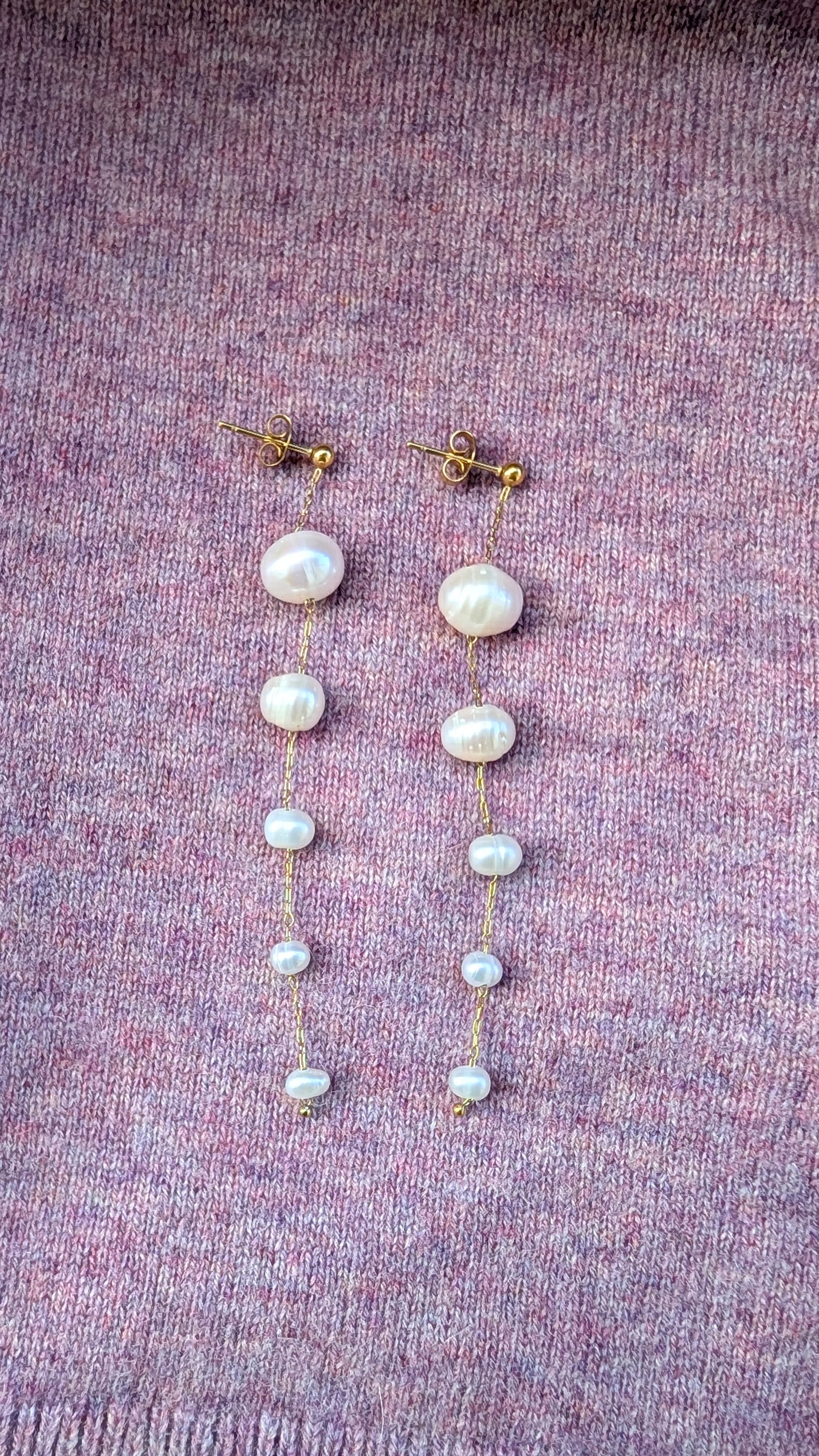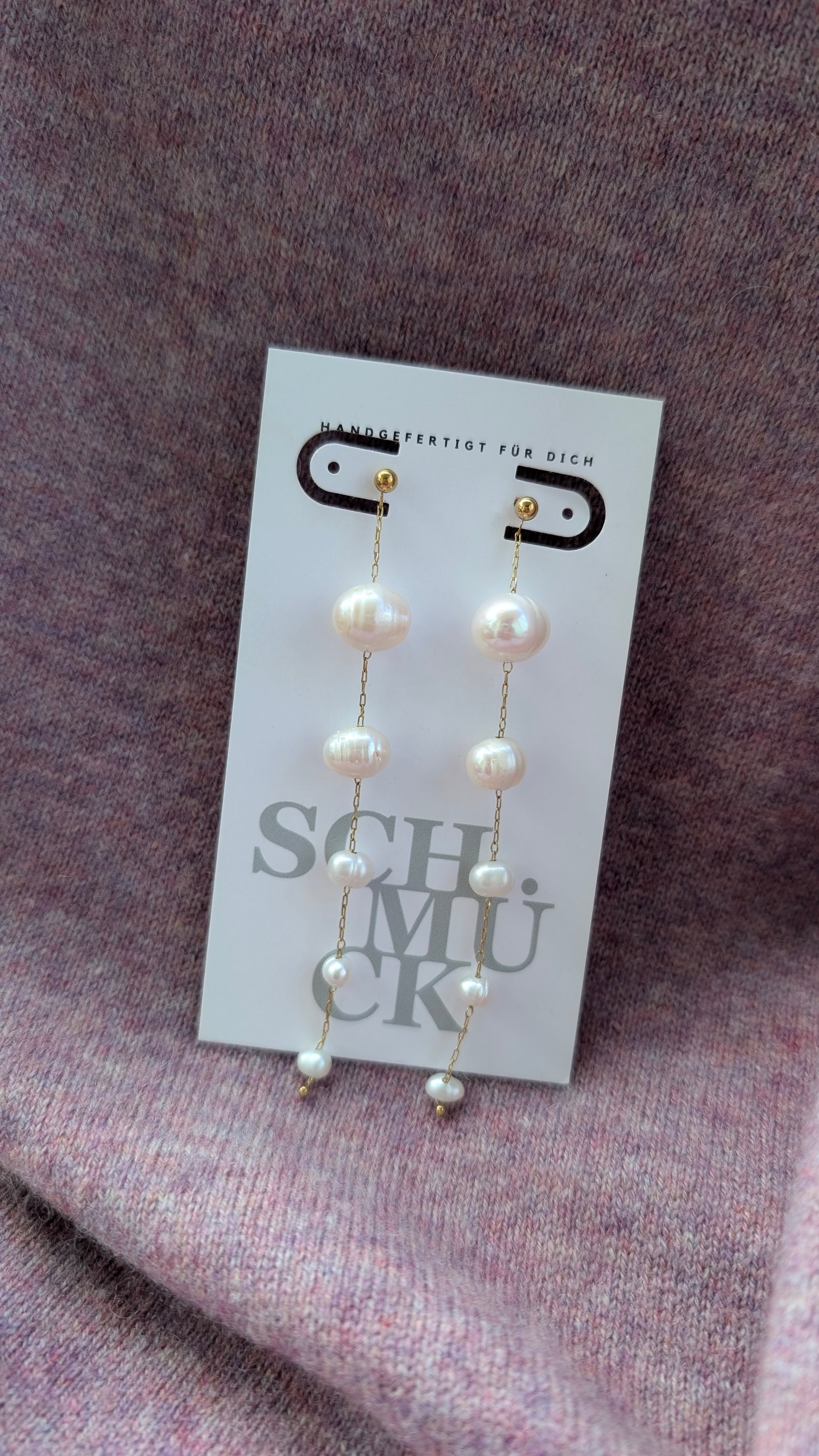 Ohrring Fine wurde aus verschieden großen Süßwasserperlen an einer 18karat vergoldeten Edelsteinkette mit einem Stecker kreiert.